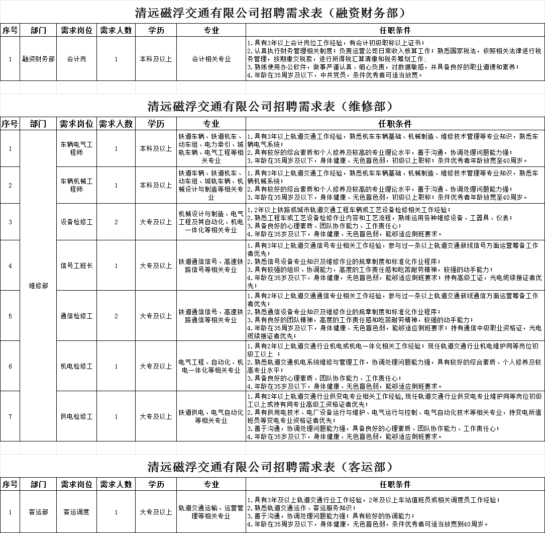 2、資料提交:應(yīng)聘人員下載填寫附件《清遠磁浮交通有限公司招聘報名信息登記表》連同身份證、學歷證、職稱證、專業(yè)技術(shù)資格證等報名資料壓縮打包后發(fā)送至電子郵箱qycf_zp@163.com;郵件名稱請按“應(yīng)聘崗位+姓名+專業(yè)”格式命名。