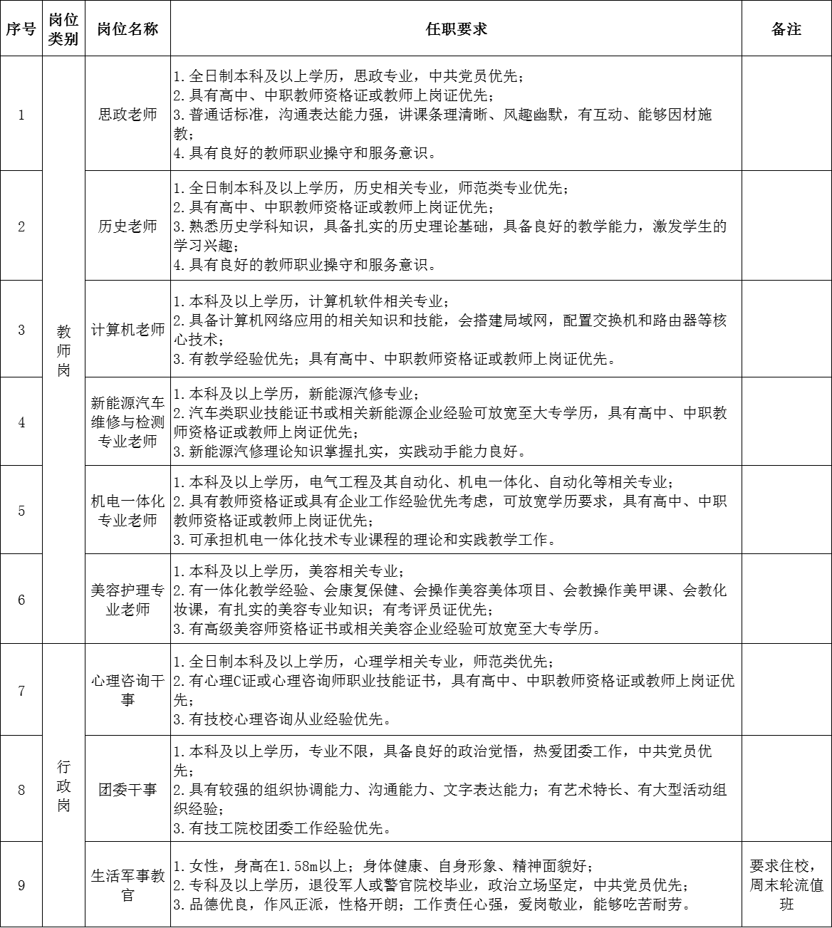 4、教師崗需本科及以上學(xué)歷,碩士?jī)?yōu)先;文化課教師需持有相應(yīng)的教資;專業(yè)課教師持有相應(yīng)技能證書(shū)/職稱或相應(yīng)行業(yè)經(jīng)驗(yàn)優(yōu)先錄用。