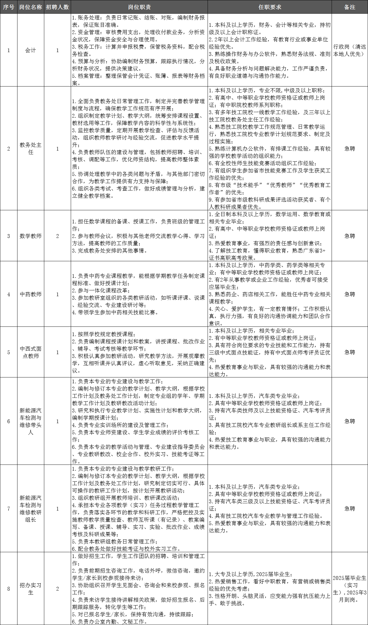 清遠市南方技工學校2025年上半年教職工招聘崗位 - 20250302更新.xlsx